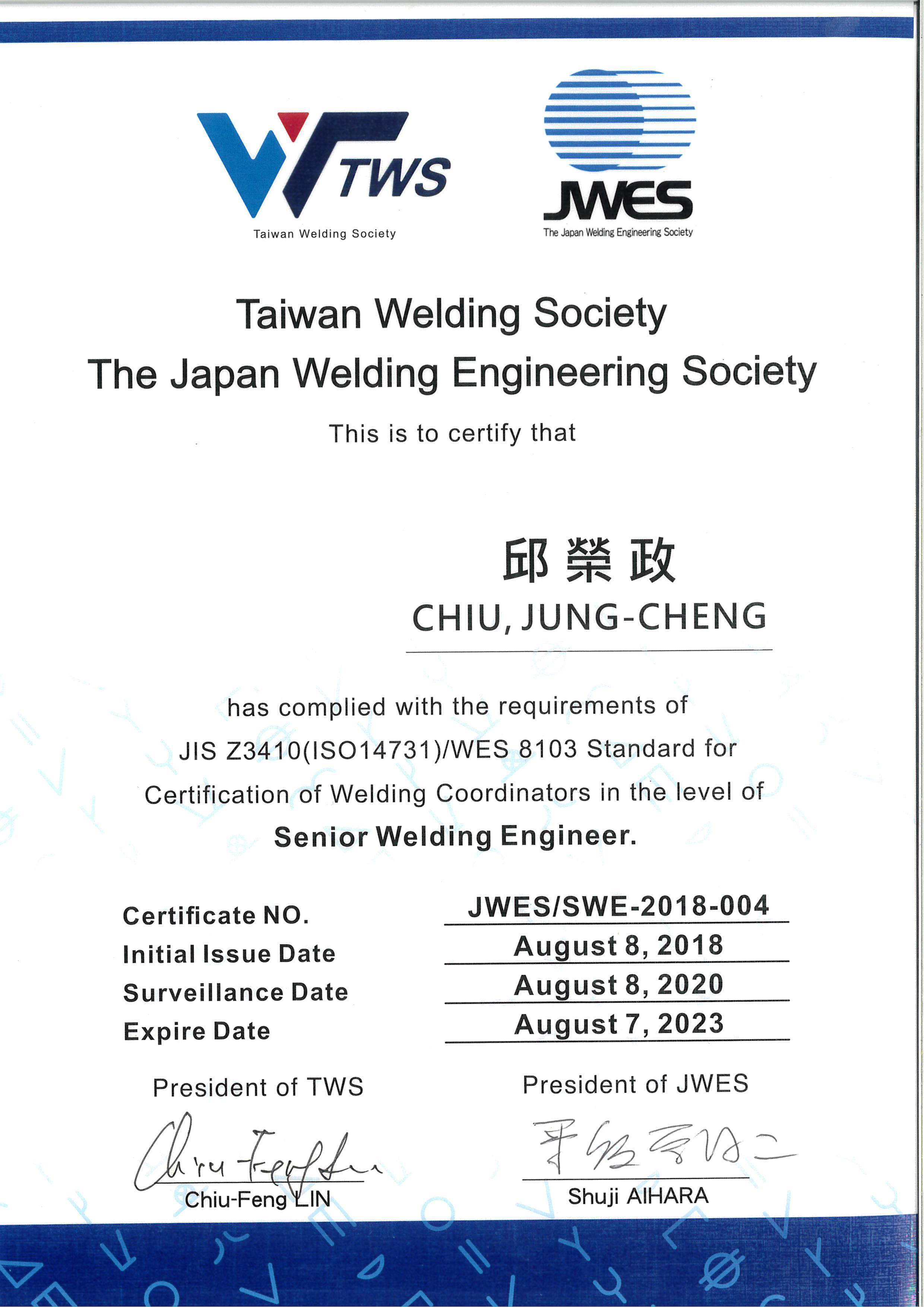 本公司負責人邱榮政先生於2017年通過台灣銲接協會與日本銲接協會聯合舉辦之銲接工程師考試並取得日本JWES認證之WE證照。